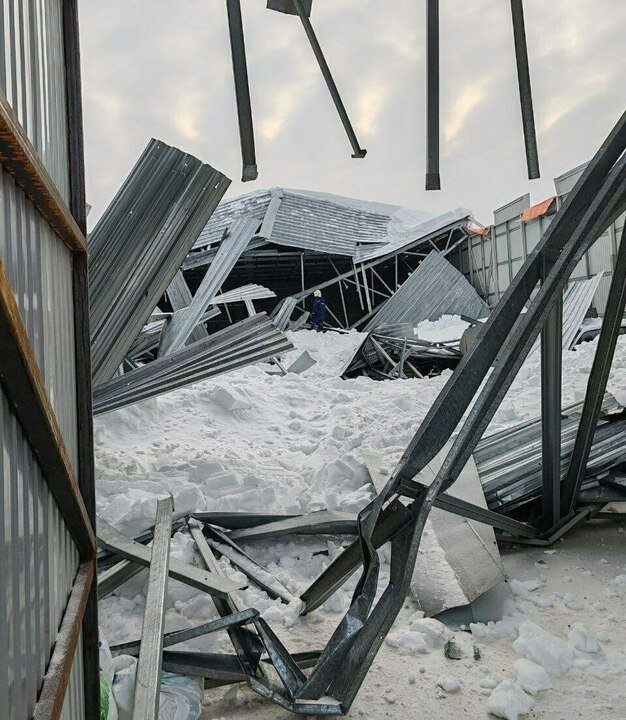 Внутри находились машина, прицеп и снегоход — арендаторы оценивают ущерб. Ранее в соцсетях сообщали об обрушении крыши дома Жеребцова.